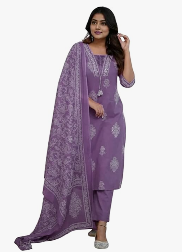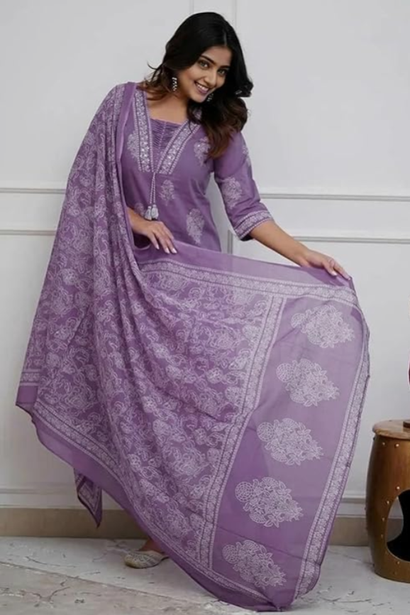 Elevate your ethnic wardrobe with the PARTHVI Women’s Pure Cotton Printed Kurta with Pants and Dupatta Set. Crafted from pure cotton fabric, this suit set offers superior comfort and breathability. The beautiful printed design with intricate handwork adds a rich and traditional touch, making it ideal for weddings, festive celebrations, parties, and special occasions. The set includes a matching kurta, pants, and dupatta, giving you a complete and elegant ethnic outfit. Stylish, comfortable, and graceful, this kurta set is perfect for women who love traditional fashion with a modern appeal.